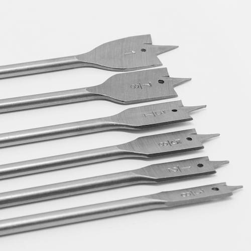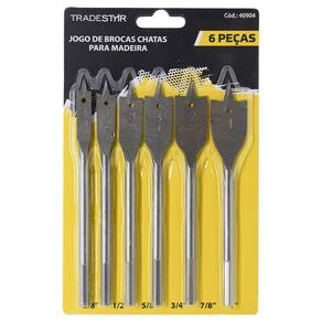 - 6 Brocas Chatas para Madeira, nos tamanhos 3/8", 1/2", 5/8", 3/4", 7/8" e 1" - Broca em aço carbono - Ideal para corte em lâminas/chapas finas de madeira - Comprimento da Broca - 6" - 15 cm