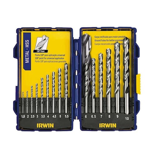 Jogo De Brocas Helicoidais Em Aço Rápido Hss Para Metal 15 peças IRWIN - Jogo de Brocas para Metal, fabricadas em aço rápido garantindo durabilidade e qualidade; - Possuem ângulo de afiação da ponta de 118º; - Corpos retificados para maior precisão; - Utilizadas para furar ferros e metais; - Acompanha estojo moldado em ABS de ótima resistência com dobradiças de metal durável e marcação das medidas facilitando a identificação das peças.