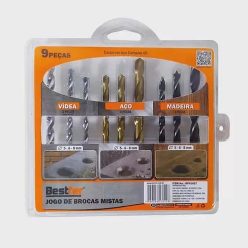 CARACTERÍSTICAS: - O kit contém 9 brocas para aplicações como Parede, Aço e Madeira; - Corpo em Aço Carbono 45; - 3 brocas Parede (Vídea): 5, 6 e 8 mm (ponta de YG8); - 3 brocas de Aço: 5, 6 e 8 mm; -3 brocas de Madeira: 5, 6 e 8 mm.