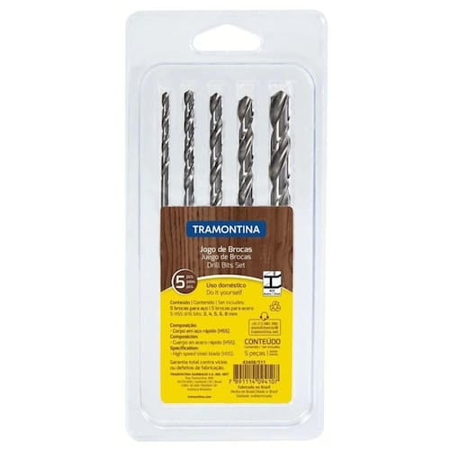 Jogo De Brocas Para Aço Tramontina 5 Peças O Jogo de Brocas para Aço Tramontina 5 Peças é o conjunto ideal para perfurar aço. Com a qualidade das brocas Tramontina, as cinco peças apresentam tamanho de 3, 4, 5, 6 e 8 mm. Além disso, são produzidas com a resistência e durabilidade do aço rápido HSS. São as ferramentas certas para as exigências de diferentes tipos de trabalho. Ean: 7891114152401