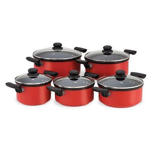 Jogo de caçarolas cordonadas 5 peças 16 a 24cm vermelha com tampa de vidro dona chefa Jogo caçarolacordonada vermelha tampa vidro 0.226 dona chefa O jogo caçarolas cordonadas é formado por 5 peças de diferentes tamanhos. A linha cordonada conta com uma dobra do alumínio na borda, tornando a panela mais reforçada e resistente. Todas as caçarolas são fabricadas em alumínio e revestidas interna e externamente com 5 camadas de antiaderente. Acompanham 5 tampas de vidro com furo para a saída do vapor. As alças e pomeis são feitos em baquelite antitérmico. Itens incluso: 01-panela 16cm de circunferência; 01-panela 18cm de circunferência 01-panela 20cm de circunferência 01- panela 22cm de circunferência 01- panela 24cm de circunferência