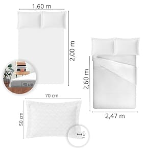 1 lençol, medindo 2,47 m x 2,60 m, com dobra feita para um visual mais elegante. 1 lençol com elástico, com dimensões de 1,60 m x 2,00 m x 40 cm, para um ajuste perfeito em seu colchão. 2 fronhas de 50 cm x 70 cm, com abas, proporcionando um toque sofisticado.