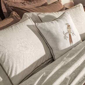 Composta por tons suaves em bege, marfim e detalhes em marrom, a estampa floral se espalha sutilmente pelas superfícies, criando uma atmosfera serena e acolhedora no quarto. A beleza desse jogo está nos contrastes sutis: a leveza do floral no sobre lençol, a sobriedade do fundo liso nas fronhas e o destaque central da almofada com bordado de pássaro, que adiciona um toque artístico e poético à composição. Cada peça carrega um cuidado especial nos acabamentos, o sobre lençol vem com dobra feita, o lençol com elástico, também estampado, é ideal para colchões de até aproximadamente 40cm de altura, as fronhas dimensionadas possuem 4 abas de 4cm, com estampa floral discreta contém um toque refinado sem exageros. Já a capa de almofada é o grande destaque visual: feita em tecido liso, ela traz um bordado localizado de pássaro com aplicação de cordonê nos quatro lados, funcionando como peça decorativa central, perfeita para compor a cama posta com charme e personalidade!