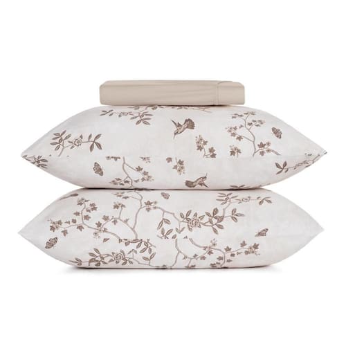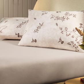 A estampa Paradis Composê traz delicadeza e elegância para o quarto com desenhos de pássaros e folhagens em tons sutis sobre o fundo bege mocha. Confeccionada com enchimento em poliéster thermobonder macio e leve, garante conforto e praticidade no dia a dia. Disponível em edredom, jogo de colcha com porta-travesseiros, jogo de cama completo com lençol superior, inferior e fronhas com viés, além da versão simples com lençol de elástico e fronhas envelope. Um toque sofisticado para transformar sua cama em um refúgio de aconchego.