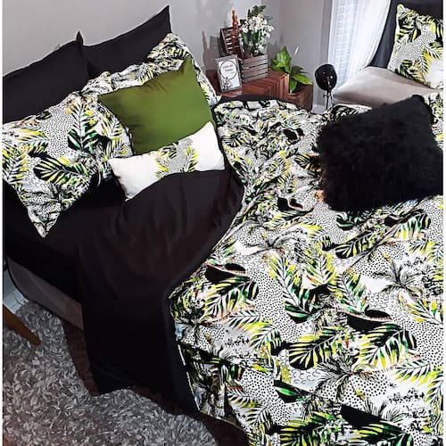 O Jogo de Cama Casal Comum 8 Peças Edredom Florestal Dark é perfeito para decorar o seu quarto com um toque tropical moderno e descontraído. Com estampa em tons de verde oliva, lima, preto e cinza, esse kit em microfibra é ideal para criar um ambiente aconchegante e cheio de estilo.