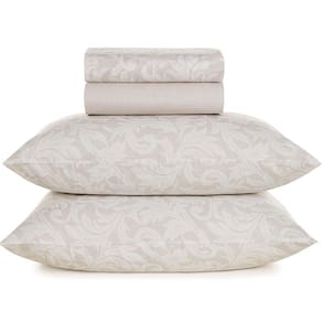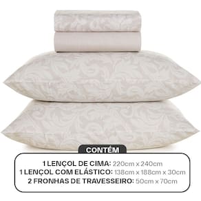O jogo inclui 4 peças: Sobre lençol (2,20m x 2,40m); Lençol de elástico (1,38m x 1,88m x 30cm) com riscas finas; 2 fronhas (50cm x 70cm)