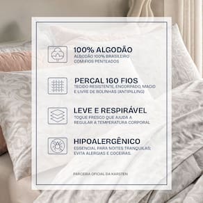 Tradição e qualidade Karsten: há mais de um século entregando conforto Feito com 100% algodão de fibras penteadas, esse jogo de cama une maciez, frescor e durabilidade. O percal 160 fios garante um toque suave e encorpado, que reduz o atrito com a pele para um descanso mais agradável. Ele ainda conta com tecnologia antipilling, que evita as indesejadas bolinhas, e é hipoalergênico, para noites tranquilas e livres de irritações.
