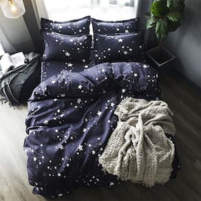 Jogo De Cama Casal King Completo 6 Peças Com Edredom Star Casal king 1 lençol com elástico para colchões de até 40 cm - lençol preto com estampas estrelas branca 1 edredom dupla face com enchimento 2,80cm x 2,80cm - frente e costas preto com estampa estrelas branca 4 capas de travesseiros de 70cm x 50cm sem enchimento - frente e costas estampa estrelas branca Composto por: Lençol, edredom e capas de travesseiros em microfibra, poliéster e elastano, toque macio e confortável. Enchimento: manta siliconada tecnológica antialérgica 100% poliéster Mais detalhes: Capa de almofadas com zíper invisível para um acabamento delicado e de fácil lavagem Nossas peças são reconhecidas mundialmente pela qualidade e veracidade a qual vendemos pela internet. As almofadas a venda é composto por todas as peças da foto imagem, incluindo os enchimentos. Nossa estampa é 100% digital, podendo lavar por varias vezes sem perder a resolução da estampa E nem desbotar com o tempo.