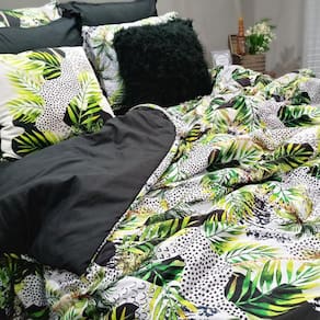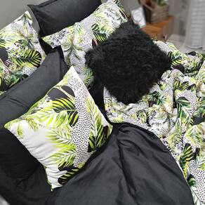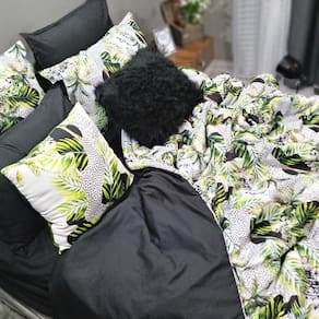 Almofadas e edredom com enchimentos Kit em microfibra percal 150 fios estampa tropical em tons de verde oliva, lima, preto, cinza e branco. Ideal para decorar o seu cantinho com um ar tropical, moderno e descontraído, a combinação florestal com preto amplia a possibilidade de incluir essa criação da grife em várias tons de ambientes diferentes, combina com tudo. Aposte nesta tendência, estampas florestais sempre agradam, além de deixar o seu quarto com um ar natural e saudável, causam uma sensação de equilíbrio e bem estar. Disponível para cama: CASAL QUEEN
