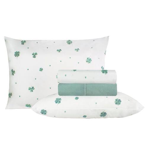Cor: Lençol de Baixo na cor Verde com pontos Branco e o Lençol de Cima e as Fronhas na cor Branco com Trevos Verde