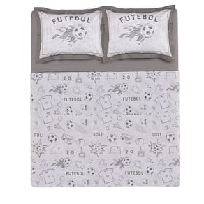 O lençol com elástico neutro na cor cinza, proporciona um contraste elegante e versátil. O sobre lençol é adornado com uma estampa dinâmica que inclui luvas de goleiros, bolas de futebol, chuteiras e troféus, capturando a essência do campeonato e inspirando sonhos de vitória. A fronha, com quatro abas de 4 cm, exibe uma bola em campo, completando o conjunto com um toque de autenticidade esportiva.
