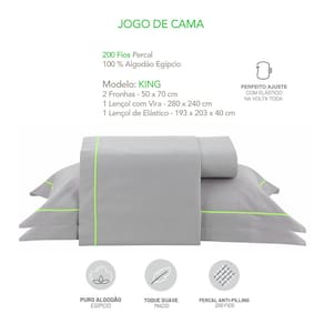 Contem: Modelo: Casal KING 2 Fronhas - 70 x 50 cm 1 Lençol com Vira - 280 x 240 cm 1 Lençol de Elastico - 193 x 203 x 40 cm Percal 200 Fios 100% Algodao Egipcio OBS: O travesseiro não acompanha as fronhas.