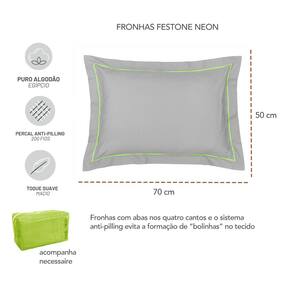 Jogo de cama 200 Fios. O Jogo de lençol Festone Neon tem como base, a exuberacia do algodao egipcio junto ao bordado em cores neon. O jogo de cama é perfeito para quem busca modernidade e estilo sem abrir mao do conforto. As fronhas possuem toque macio e unem jovialidade e sofisticaçao. Anti-pilling é um tratamento que visa eliminar fibras soltas, evitando a formaçao de bolinhas no tecido.