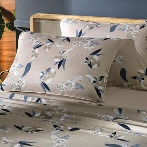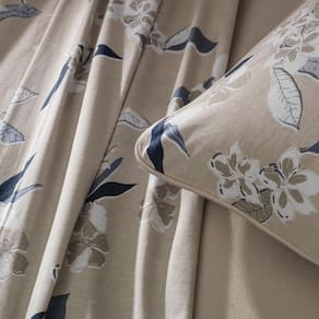 A estampa Kyoto combina a suavidade do bege mocha com flores e folhagens em tons de azul e cinza, criando um visual sofisticado e acolhedor para o quarto. Confeccionada em puro algodão de alta maciez, a coleção oferece edredom com enchimento em poliéster thermobonder leve, colchas com viés e porta-travesseiros no tamanho padrão com abas e acabamento em matelassado quadriculado, que mantém o enchimento bem distribuído e confere um relevo elegante. O jogo de cama completo traz lençol superior com dobra feita, lençol inferior com elástico que se adapta a colchões queen e king de até quarenta centímetros de altura e fronhas estilo envelope com viés e acabamento em rolotê. Já o jogo de cama simples é ideal para o dia a dia, com lençol de elástico e fronhas envelope sem abas. Uma coleção versátil que une conforto, praticidade e beleza em cada detalhe, perfeita para transformar sua cama em um refúgio acolhedor.