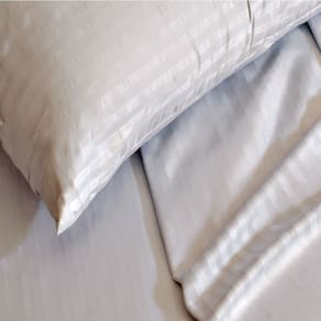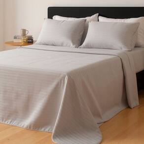 Desenvolvido em Micropercal, este jogo possui uma textura suave e sedosa. Esse lençol proporciona uma sensação agradável ao toque e é ideal para todas as estações, pois mantém o frescor sem reter muito calor durante o verão. O visual minimalista com listras horizontais adiciona charme e um toque de elegância.