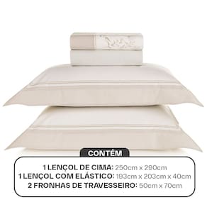 Sobre lençol (2,50m x 2,90m) com dobra feita; Lençol de elástico (1,93m x 2,03m x 40cm) com riscas finas; 2 fronhas (50cm x 70cm) com abas de 5cm.