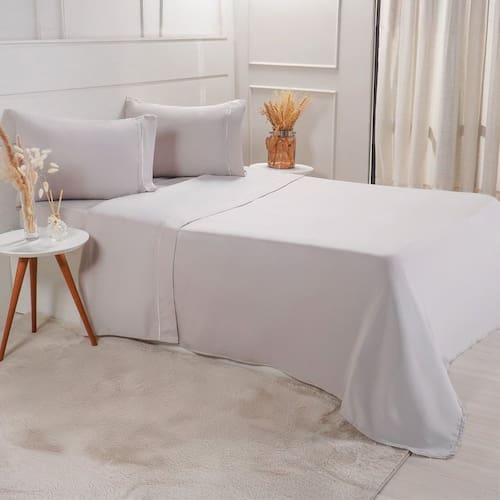 Ajuste Perfeito: As dimensões do jogo de cama são projetadas para se ajustarem perfeitamente a camas King Size, com o lençol com elástico proporcionando uma fixação segura e sem enrugar.