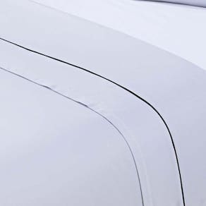 O Jogo de Cama Gran Moratta é confeccionado com tecido Percal 100% Algodão, o lençol de baixo e as fronhas são Brancos, o lençol de cima possui cor suave e detalhe em Vivo.