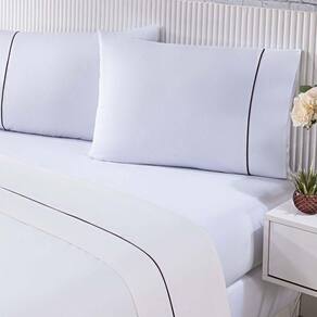 O Jogo de Cama Gran Moratta é confeccionado com tecido Percal 100% Algodão, o lençol de baixo e as fronhas são Brancos, o lençol de cima possui cor suave e detalhe em Vivo.