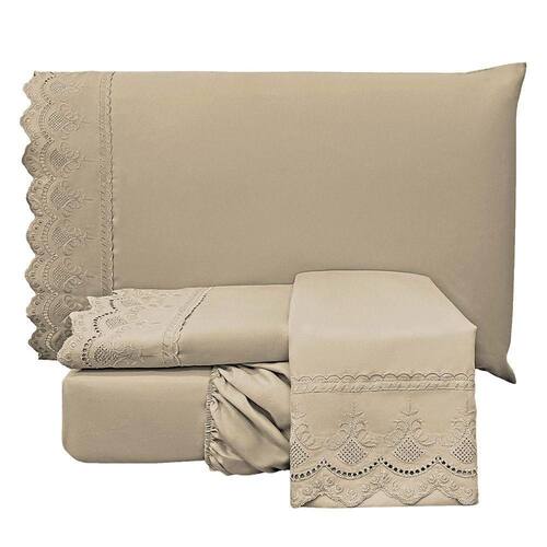Jogo De Cama Lençol Realce King 4 Peças Percal 300 Fios Bordado Inglês Macio Chocolate 100% Poliéster - Marrom Chocolate