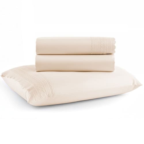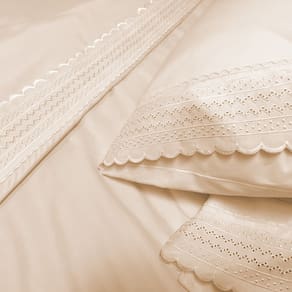 O sobre lençol de fios penteados adiciona um toque de sofisticação à sua cama, enquanto a fronha para travesseiro com renda que completam o conjunto, proporcionando conforto para o seu travesseiro, garantindo uma excelente experiência para seu descanso.