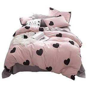1 edredom dupla face com enchimento 180x240cm - Frente cor rosé com estampa corações preto - Costas cinza claro no mesmo tom do lençol.