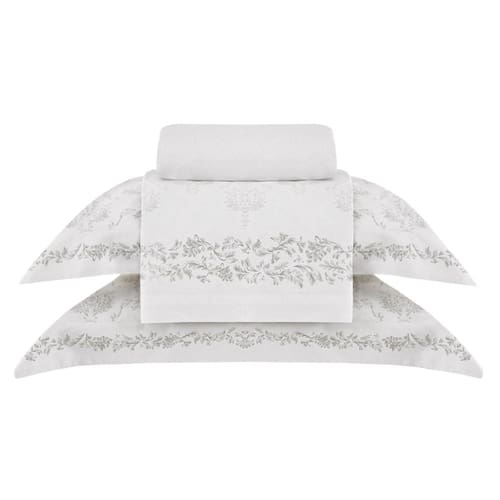 A estamparia com arabescos em tons de cinza e moldura em mini arranjos florais destacam-se no sobre lençol e fronhas com elegância e refinamento. A base do lençol vem em padrão xadrez conferindo harmonioso complemento. Em puro algodão com fibras longas, o modelo possui a suavidade e maciez incrível do toque acetinado. Muito confortável, resistente e fácil de manter.