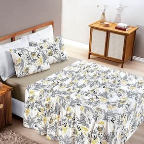 Contém um lençol de baixo com elástico, um lençol de cima e duas fronhas.