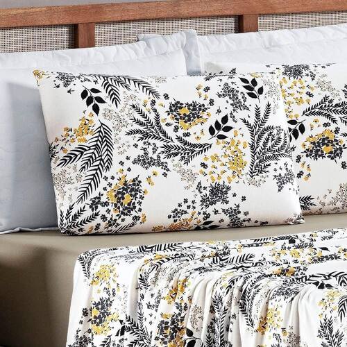 Contém um lençol de baixo com elástico, um lençol de cima e duas fronhas.