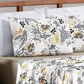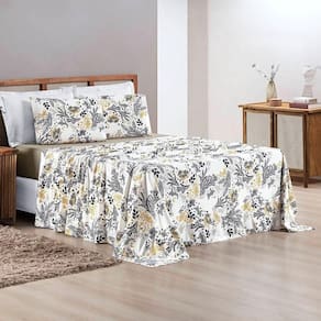 Contém um lençol de baixo com elástico, um lençol de cima e uma fronha.