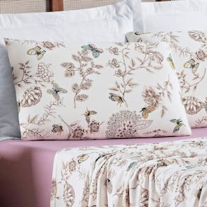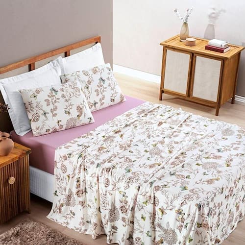 Contém um lençol de baixo com elástico, um lençol de cima e uma fronha.