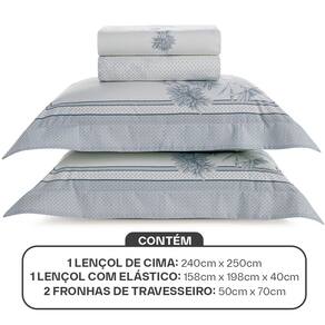 O jogo inclui 4 pecas: Sobre lencol (2,40m x 2,50m) com dobra feita Lencol de elastico (1,58m x 1,98m x 40cm) com riscas finas 2 fronhas (50cm x 70cm) com abas de 5cm