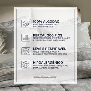 Feito com 100% algodao de fios penteados, o tecido em percal 200 fios oferece um toque fresco e macio, ajudando a regular a temperatura e proporcionando menos atrito com a pele.