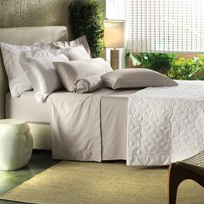 O lençol superior traz o mesmo bordado em posição de destaque na vira, transformando o gesto de arrumar a cama em um momento de cuidado e estilo. O lençol com elástico completa o conjunto com praticidade e conforto.
