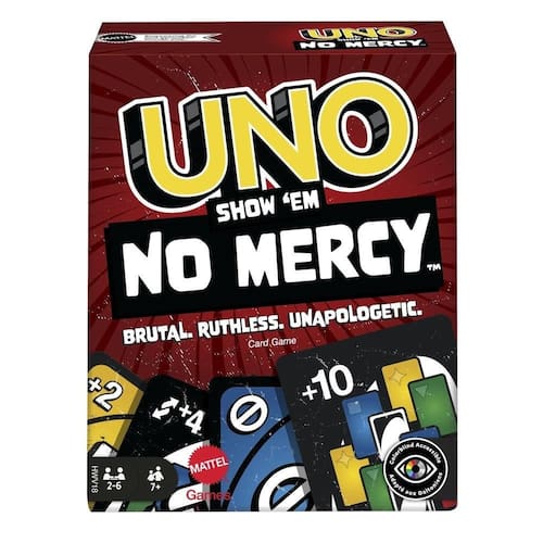Características Adicionais: Versão mais implacável do clássico UNO 56 cartas adicionais com ações inéditas e penalidades severas Novas cartas como "Compra 10", "Compra 6" e "Pule Todos" Duas formas de vitória: zerar a mão ou eliminar todos os adversários Regra da Misericórdia: elimina jogadores com mais de 25 cartas