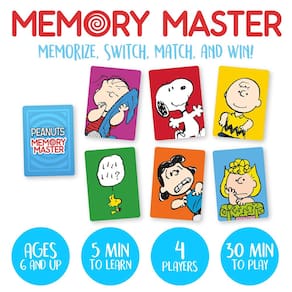 AQUARIUS - Peanuts Memory Master Card Game - Um jogo de cartas que você nunca esquecerá: teste sua memória com Snoopy, Charlie Brown e o resto da turma com este divertido jogo de cartas Peanuts. - 108 cartas temáticas: inclui 6 imagens temáticas exclusivas do Peanuts em 6 cores diferentes. Cada cartão é impresso 3 vezes. - Memorize, troque, combine e ganhe! Faça parceria e compita em um jogo de memória em casa ou em qualquer lugar! - Torne-o uma noite de jogo: 5 minutos para aprender o jogo | 30 minutos para jogar | 4 jogadores (2 times) | A partir de 6 anos