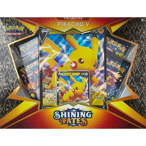 The Pokémon TCG: Coleção Shining Fates — Pikachu V inclui: 1 carta promocional com Pikachu V 1 carta grande com Pikachu V 4 Pokémon TCG: pacotes booster Shining Fates Uma carta de código para o Pokémon Trading Card Gam e Online - 1 cartão promocional com Pikachu V - 1 cartão de tamanho grande com Pikachu V - 4 pacotes booster Pokémon TCG: Shining Fates
