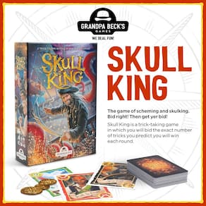 Grandpa Beck's Games Skull King - The Ultimate Pirate Trick Taking Game | dos criadores de Cover Your Assets & Cover Your Kingdom | 2-8 jogadores 8+ - Seu objetivo: lance corretamente o número de truques que você acha que vai ganhar a cada rodada neste emocionante jogo de cartas. Ganhe pontos por lances corretos, mas perca pontos se ganhar mais ou menos truques do que você lance. Domine a estratégia para maximizar sua pontuação! - Diversão familiar: mergulhe neste jogo de cartas de ritmo acelerado, com tema pirata. Cartas especiais como sereias, piratas, o famoso rei da caveira e a nova baleia branca e Kraken trazem estratégia infinita para cada rodada! Lance corretamente para ganhar pontos — dê errado, e é o armário de Davy Jones para você! - AMADO EM TODO O MUNDO: jogado globalmente em mais de 20 idiomas, Skull King é um jogo de cartas de alta qualidade apreciado por crianças, adolescentes, pais, famílias e jogadores. É a melhor escolha para noites de jogos, festas, férias ou qualquer ocasião divertida. - Jogo de cartas para todas as idades: Se você tem 7 ou 107 anos, Skull King é rápido de aprender e divertido de jogar! Perfeito para noites de jogos com a família ou amigos, Skull King certamente será um sucesso! - Trusted by Millions: Grandpa Beck's Games, criadores de best-sellers como "Cover Your Assets" e "Skull King", já venderam mais de dois milhões de jogos! Conhecida por oferecer jogabilidade envolvente e versátil, nossa coleção inclui estratégia, combinação, eliminação e muito mais. Estes jogos são perfeitos para qualquer reunião, oferecendo diversão e estratégia que todos podem desfrutar, seja em uma noite de jogo em família ou em um encontro casual com amigos. Junte-se aos milhões que descobriram nosso compromisso de unir as pessoas através da alegria de jogar.