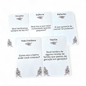 Com cartas cheias de encanto, o jogo desafia você contar a sua histórias de vida, despertando lembranças e fortalecendo o raciocínio. Cada rodada é uma nova oportunidade de exercitar o cérebro, dar boas risadas e compartilhar momentos especiais com amigos e família.