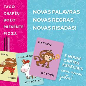 Guarde estas 5 palavras malucas na cabeça. Jogue uma carta enquanto fala uma das palavras. Assim que coincidir uma carta jogada com a palavra falada, corra para bater sua mão na pilha central. O último a bater pega a pilha toda. Seja rápido para ser o primeiro a se livrar das suas cartas e vencer o jogo. Mas cuidado! Sua mente irá pregar peças em você. Este jogo viciante é tão único quanto seu nome. Divirta-se! Taco Chapéu é o irmão mais novo da Família Taco Gato! E adivinha? Nesta versão, além das novas palavras você faz os gestos ao mesmo tempo que bate sua mão na carta – mais um desafio para você e seus amigos!