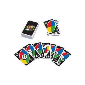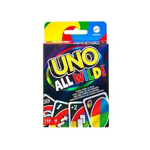 No jogo de cartas UNO All Wild, cada carta é um curinga, tornando o jogo uma versão ainda mais rápida e imprevisível do popular jogo de cartas familiar! Você não precisa combinar números ou cores como no UNO normal, mas não é tão fácil quanto parece. Cartas especiais realmente mudam o curso do jogo! As cartas especiais incluem o curinga ?skip two?, onde dois jogadores são pulados em vez de apenas um jogador, um curinga ?troca forçada?, onde os jogadores devem trocar as cartas em sua mão, e muito mais!