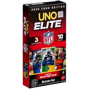 Descrição do produto : " Amplie sua escalação de jogadores da NFL com os kits UNO Elite NFL Booster Sets, oficialmente licenciados! Importante: é necessário ter o Starter Pack, incluso no UNO Elite NFL 2025 – Core Edition (vendido separadamente). Cada kit do UNO Elite NFL Booster vem com 3 pacotes de expansão, contendo 10 cartas de Ação Elite cada, totalizando 30 cartas extras. Quais estrelas da NFL você vai encontrar? São mais de 2.000 cartas de Ação Elite disponíveis para elevar o nível das partidas! Cada carta apresenta um jogador e ativa seu poder especial quando uma carta da mesma cor, com o ícone Elite, é jogada. Alguns pacotes trazem cartas Cor Dupla ou Selvagens. E quando restar só uma carta, grite com tudo: “Hut, hut, UNO!”. É um presente imperdível para fãs de jogos de cartas e da NFL, a partir dos 7 anos de idade. Cada kit é vendido separadamente, sujeito à disponibilidade. Cores e decorações podem variar. Os jogadores podem ampliar sua escalação de jogadores da NFL com os kits UNO Elite NFL Booster Sets, oficialmente licenciados! É necessário ter o Starter Pack, que vem no UNO Elite NFL 2025 – Core Edition (vendido separadamente). Cada kit licenciado inclui 3 pacotes de expansão, com 10 cartas de Ação Elite cada, totalizando 30 cartas surpresa! Quais estrelas da NFL você vai encontrar? Alguns pacotes de expansão podem conter cartas Cor Dupla ou cartas Selvagens que deixam a partida ainda mais imprevisível. Fique de olho nas raras cartas Víbora Selvagem! Cada carta de Ação Elite traz um astro da NFL e ativa um poder especial ao jogar uma carta da mesma cor, com o ícone Elite. Os jogadores podem montar seu próprio time com as cartas de Ação Elite. Os kits Booster aumentam o elenco com mais jogadores e ações poderosas! Símbolos gráficos especiais foram adicionados às cartas para ajudar a identificar as cores, permitindo que pessoas com qualquer tipo de daltonismo possam jogar! : " Detalhes técnicos : Marca: Mattel : Referência: JHG47 : Idade recomendada: 7 : Material: Papel cartão : Ean: 194735330959 : Peso (kg): 0,07 : Dimensões aproximadas da embalagem: 12 x 6 x 2 cm : Inclui: 3 pacotes booster com 10 cartas de Ação Elite cada (30 no total). Produto com oficial oficial. :