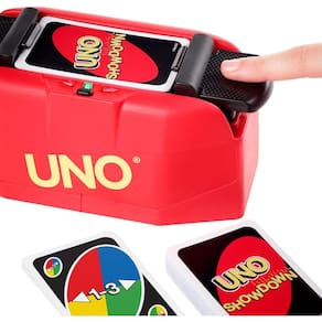 O UNO Showdown é o jogo de cartas combinadas que todo mundo adora, mas com a emoção inesperada de um confronto de disparos de cartas! Quando o relâmpago soar e o sinal da unidade UNO Showdownfor acionado, você deve tentar ser o primeiro a empurrar o pedal para baixo. O jogador mais rápido vence o confronto e envia cartas UNO Showdown voando para seus adversários! Os jogadores correm para se livrar de todas as suas cartas, combinando-as com a carta mostrada no topo do baralho. Quando os jogadores tiverem apenas uma carta, eles devem se lembrar de gritar "UNO!" Divertido para a noite de jogos de crianças, famílias ou adultos e um ótimo presente para jogadores com 7 anos ou mais