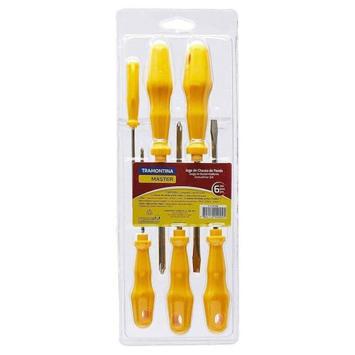 Se você preza por um completar seu kit de ferramentas, precisa do Jogo de Chaves de Fenda Tramontina Yellow 6 Peças. Um jogo que traz chaves de fenda com ponta chata, ponta cruzada e ainda uma chave clipe, ideal para fixar em cintos e alças e que é um coringa na hora de apertar ou afrouxar parafusos. Todas as peças são muito resistentes: têm hastes produzidas em aço especial cromado e cabos em polipropileno injetado. Além disso, são altamente duráveis e vão levar muito mais praticidade na execução de suas tarefas. Garanta o seu e facilite o seu dia a dia!