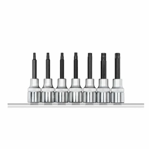 Jogo de chaves soquete com encaixe de 1/2 é composta por 7 peças fabricadas em aço cromo-vanádio, com polimento brilhante, oferecendo resistência e durabilidade. - Encaixe quadrado conforme DIN 3120 - C12,5,ISO 1174, com estria de retenção de - Suporte de parede longo em metal de 8" - 200mm - Chave soquete 1/2 TX longa perfil hexalobular - Haste fosfatizada - Polimento brilhante - Aço cromo-vanádio - Medidas dos soquetes: T20 - T25 - T30 - T40 - T45 - T50 - T55 - : 1 ano - Marca: GEDORE RED Ref.: GEDORE RED-R62458007 Ean: 4060833000468
