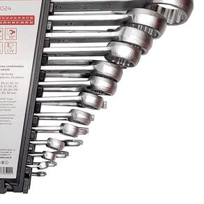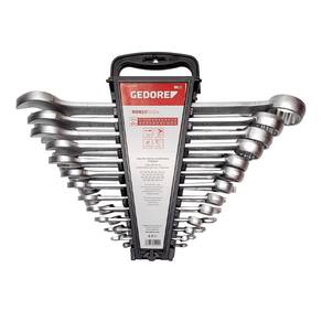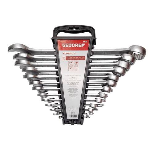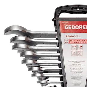 Jogo composto por chaves combinadas em milimetros (mm) Composição do Jogo: 6; 7; 8; 9; 10; 11; 12; 13; 14; 15; 16; 17; 18; 19; 20; 21; 22; 23; 24; 26; 27; 28; 30; 32 mm Fabricadas conforme normas DIN 3113 forma A, ISO 3318 e ISO 7738 Posição da boca 15° Posição da cabeça ( lado estrela) 15° Acabamento cromado fosco Aço cromo vanádio Com suporte especial GEDORE RED