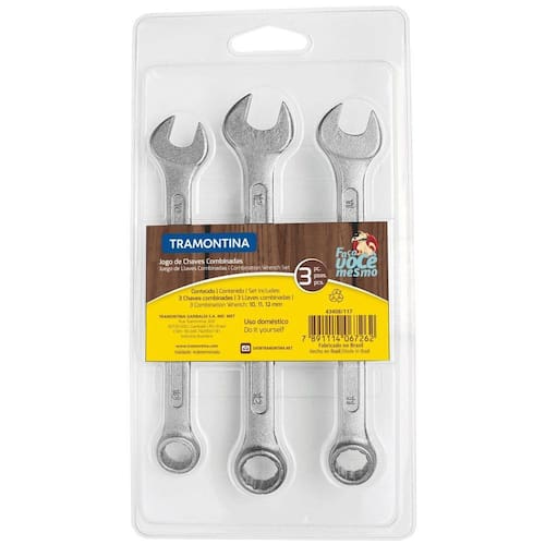 Com o Jogo de Chaves Combinadas Tramontina 3 Peças você alia a chave de boca e a chave estrela em diferentes bitolas, algo que vai tornar as suas tarefas em casa muito mais fáceis de serem resolvidas. As chaves estrela são muio versáteis e se adaptam a diversos tipos de tamanhos de porcas e parafusos. Não passe aperto, adicione essas peças a sua caixa de ferramenta. Orientações 1. O teste de dureza é realizado em vários pontos para assegurar a resistência ao desgaste da chave durante o uso ininterrupto.2. As aberturas das bocas das chaves de aperto são verificadas com gabaritos calibrados, o que garante seu perfeito acoplamento nos parafusos.3. Alguns tipos de chaves de aperto são fornecidos em bitolas métricas e em polegadas, para o uso nos diversos fixadores disponíveis.4. As ferramentas são produzidas e testadas conforme normas específicas. Características Gerais EAN13 7891114067262 DUN14 17891114067269 NCM 8204.11.00 Peso Líquido 0,1000 kg. Peso Bruto 0,1950 kg. Metragem 0,000347 m³. Dimensões Embalagem (Compr. X Larg. X Alt.) 210x 110x 15 mm. Observações Sempre utilizar óculos de segurança para proteger os olhos.Não golpear as chaves, a não ser que sejam projetadas para este fim.Sempre utilizar uma chave de bitola correta para cada parafuso ou porca para que não haja folga, pois isso danifica a chave e o parafuso.Manter a chave limpa para um melhor agarre, pois usá-la suja com graxa ou óleo pode causar acidentes.Não usar tubos ou outras barras de extensões para obter mais torque.Não alterar a forma original das chaves.