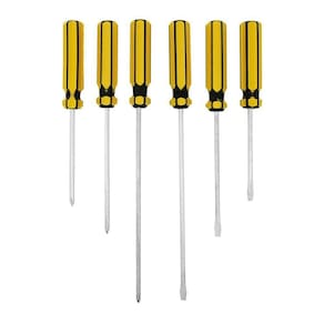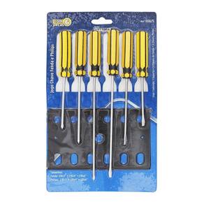 Contem: 3 Chave Fenda: 1/8x3, 1/8x4 e 1/8x6 3 Chave Philips: 1/8x3, 1/8x4 e 1/8x6 - Dimensoes da Embalagem: 16 x 1,6 x 26,5cm (CxLxA) - Tipo de Embalagem. Blister - Quantidade Inner: 12 pecas - Dimensoes Inner: 45 x 28 x 4cm (CxLxA) - Quantidade Master: 60 pecas - Dimensoes Master: 46 x 25,5 x 19cm (CxLxA) - Material: Aco 45 e PVC (Policloreto de vinil) - Cor: Amarelo - Marca: Western - Origem: China
