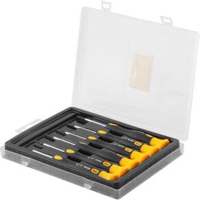 1 Jogo de chaves de precisão, composto por um estojo plástico com 6 peças, sendo: 3 fenda (1,4 mm, 2,00 mm e 3,00 mm) e 3 phillips (PH1, PH0 e PH00). Possui haste em aço carbono cromado e cabo anatômico que confere maior aderência e transmissão de força, e apoio superior giratório que facilita a execução do trabalho. Indicado para relojoarias, eletrônicas, serviços de precisão, entre outros.