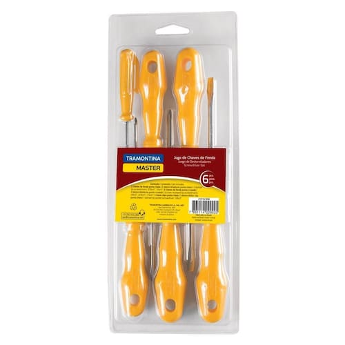 Jogo De Chaves De Fenda Tramontina Yellow 6 Peças Jogo de Chaves de Fenda Tramontina Yellow 6 Peças Se você preza por um completar seu kit de ferramentas, precisa do Jogo de Chaves de Fenda Tramontina Yellow 6 Peças. Um jogo que traz chaves de fenda com ponta chata, ponta cruzada e ainda uma chave clipe, ideal para fixar em cintos e alças e que é um coringa na hora de apertar ou afrouxar parafusos. Todas as peças são muito resistentes: têm hastes produzidas em aço especial cromado e cabos em polipropileno injetado. Além disso, são altamente duráveis e vão levar muito mais praticidade na execução de suas tarefas. Garanta o seu e facilite o seu dia a dia!